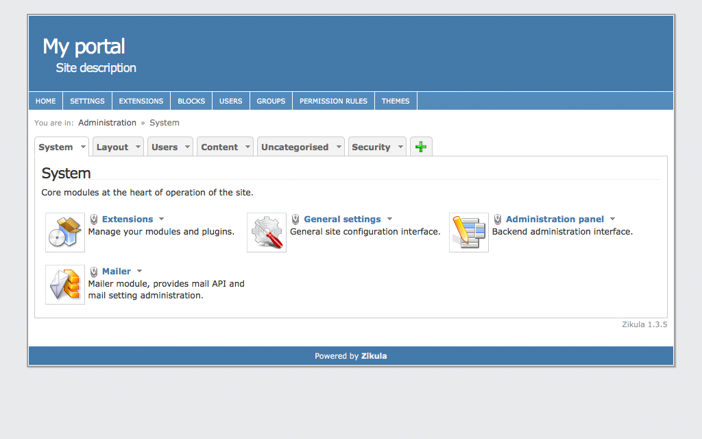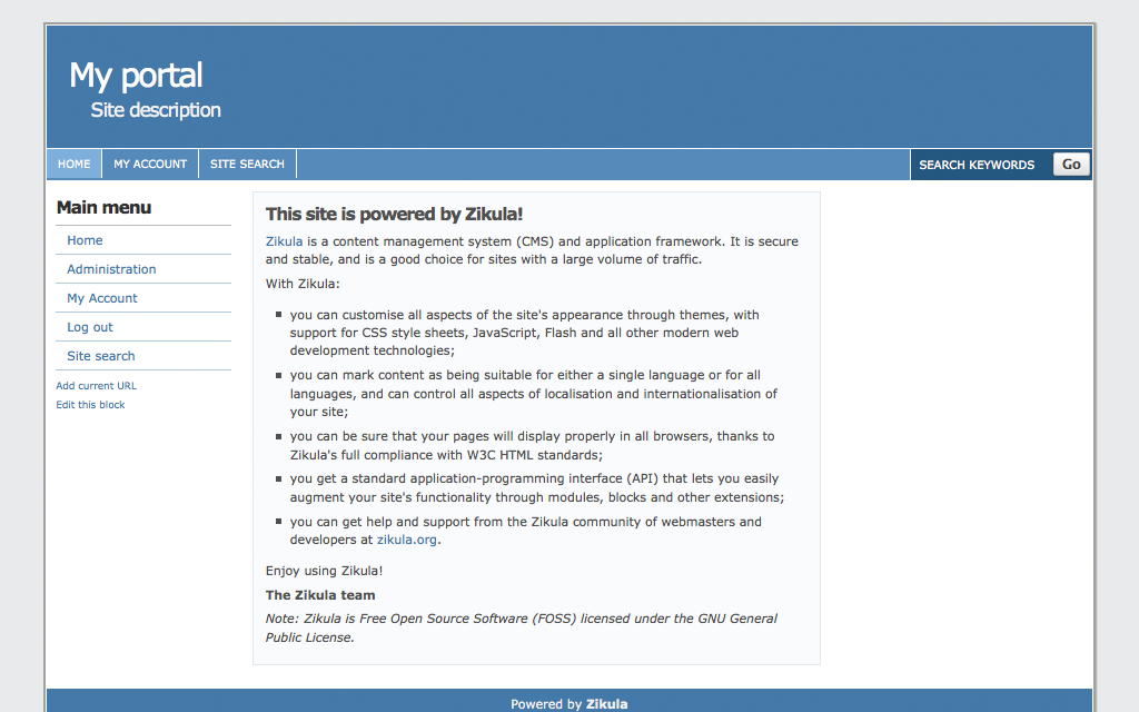 ZikulaZikula is an open source content management and portal application. Zikula forked from PHP-Nuke in 2001. ![]() No matter what your needs, Zikula can provide the solution. Be that a corporate presence with ecommerce, a simple blog or a community portal, Zikula can do it all. It's your electronic toolbox, a set of tools allowing you to build a dynamically generated web site that five years ago would have cost thousands of dollars to launch.